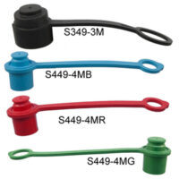 Hydraulic caps and plugs help reduce contamination of the hydraulic system and improve the service life of the body half (coupling) and the mating tip half (nipple). Dust plugs are designed to protect the body, and dust caps protect the tip. Molded rubber color options include black, blue, red and green.